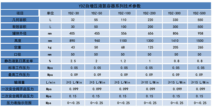 注:承接各類特殊低溫容器,表中未列出的規格(15L-800L),可按客戶要求制作,具體商議。100L及以上可配液位計;其中YDZ-**W代表臥式液氮罐。